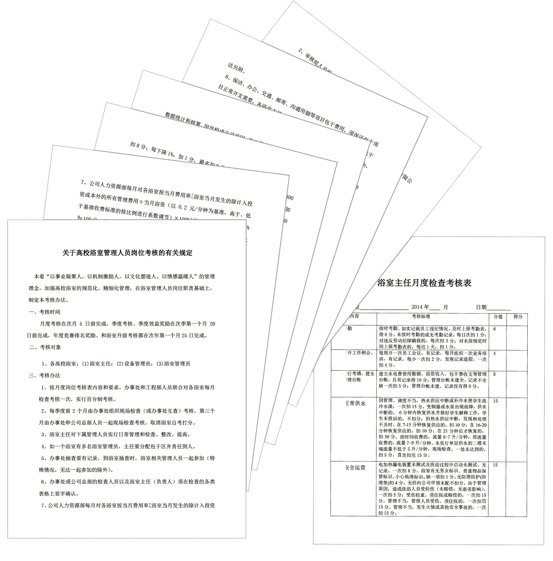 浴室管理制定年度目标、月度任务和每周措施,根据工作职责,每个月对浴室进行考核,按考核进行排名,同一岗位进行评比,根据排名兑现工资奖惩,对前三名进行奖励,对后三名进行惩罚。并根据排名印发简报,显著地调动职工工作积极性,促进浴室工作管理规范化。