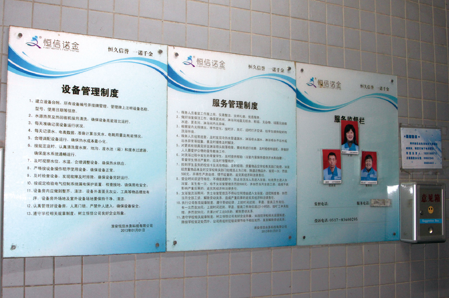 为能随时掌握学生和学校管理部门对浴室管理反映的真实情况,"恒信诺金"设立投诉电话、二维码微信公众号监督平台、邮箱等多种形式接受投诉和反映,对学生的投诉必须在一个小时内响应,一般问题应当场解决,不得超过一天。