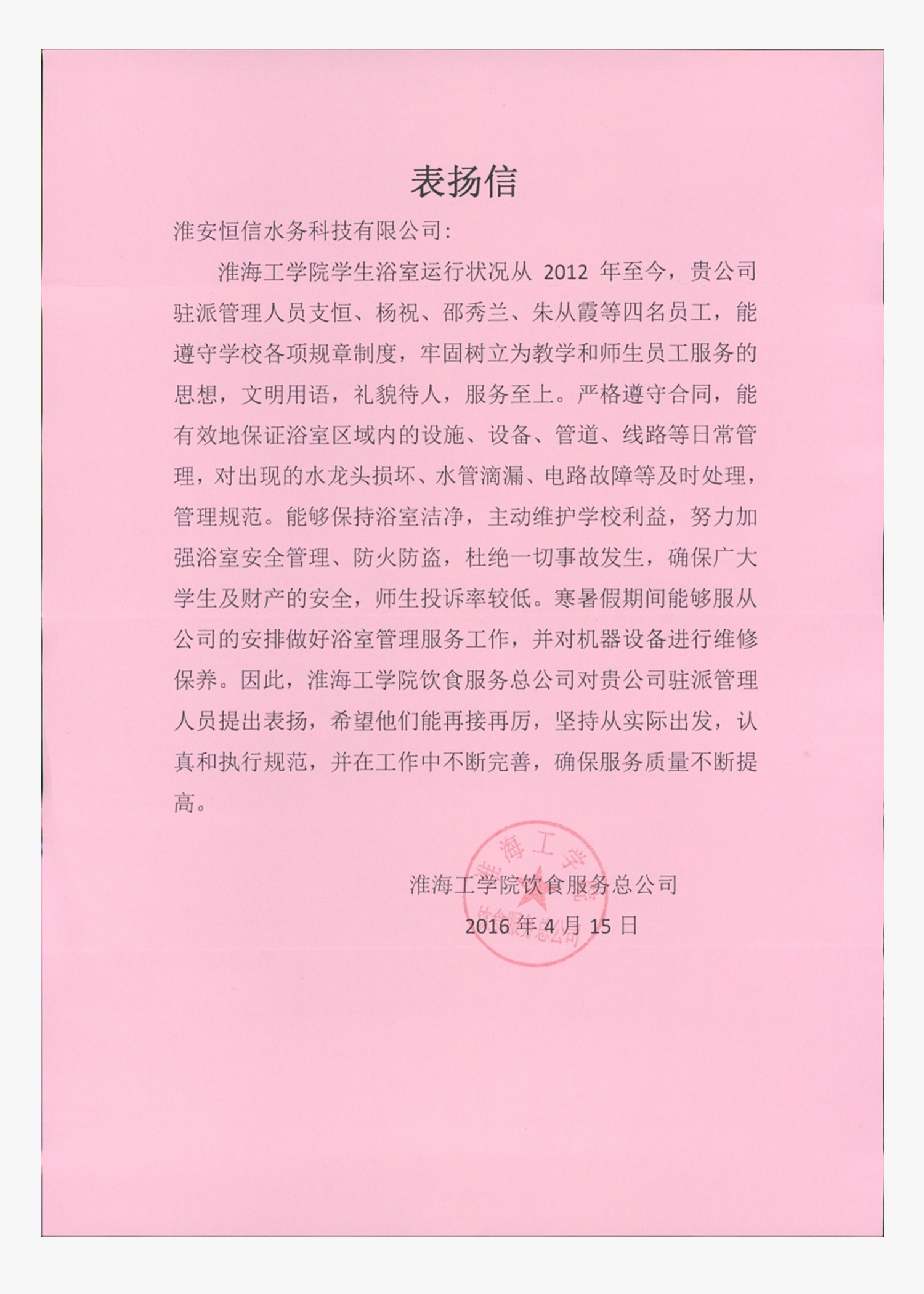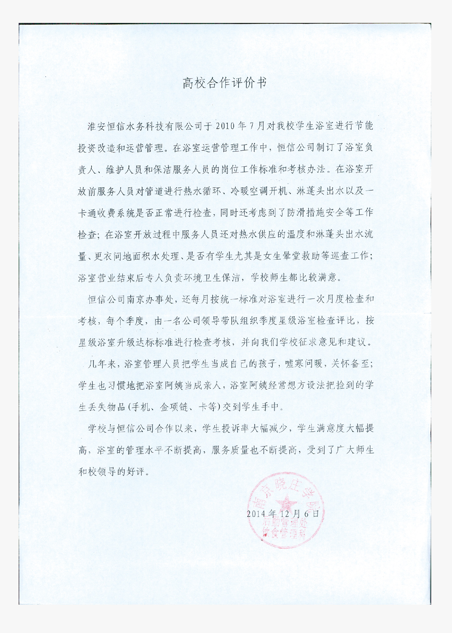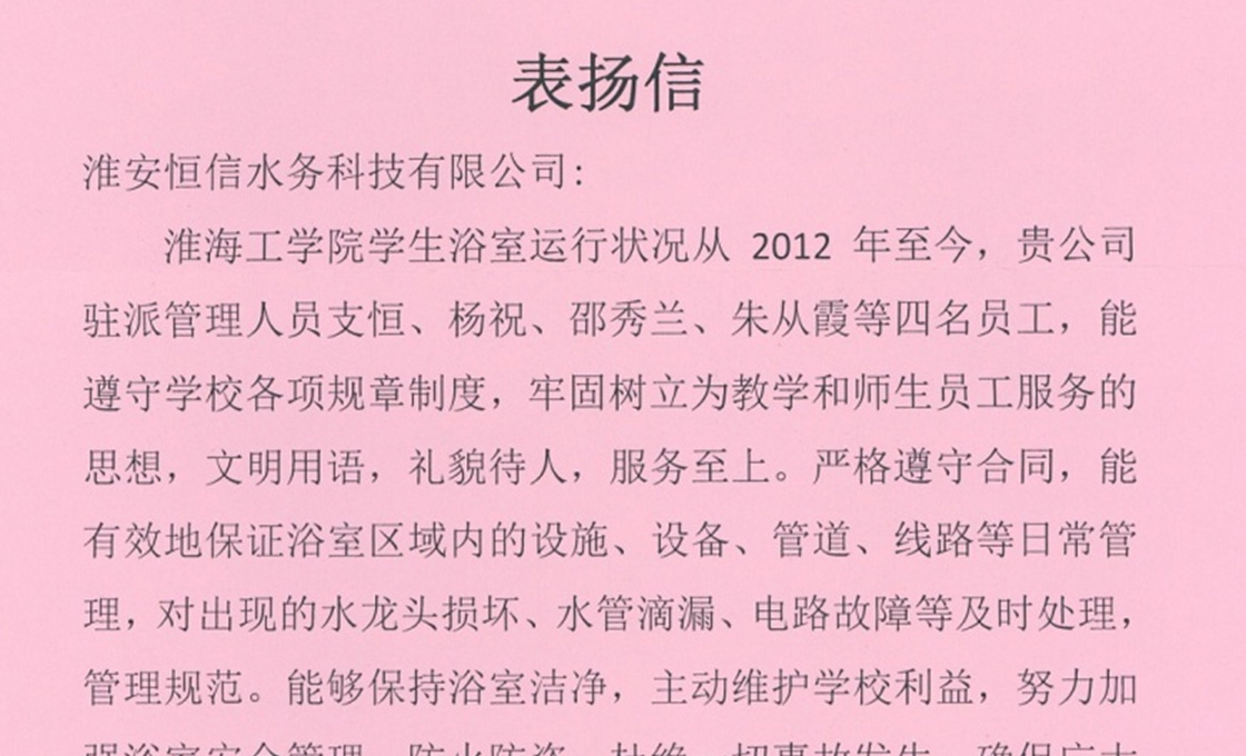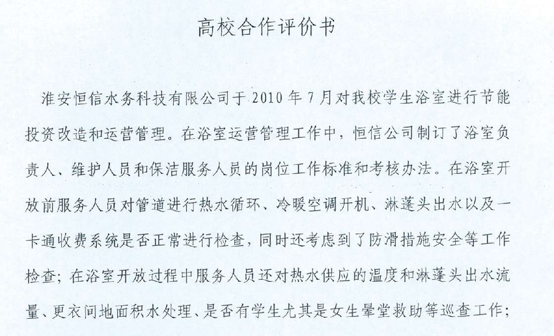 公司上至董事长、总经理,下至每个办事员,都把"一切为了学生,把学生当亲人"当做服务宗旨,并将其落实在行动上,落实在各项工作上。公司从硬件上着力改善学生洗浴条件,软件上注重提升洗浴服务质量和服务水平,受到所服务高校师生的好评,2011年12月,在全国高校浴室洗浴行业中,被评为"全国高校后勤服务优秀企业"。