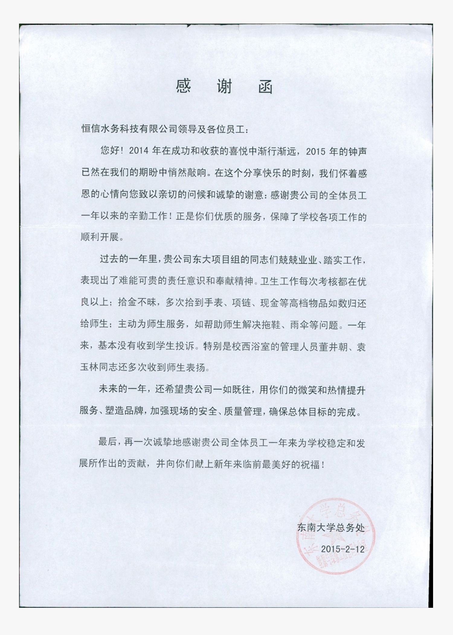 恒信诺金提高服务态度、提高服务质量、注重过程管理,为每一名学生提供更加贴心的服务,10年来,在各大院校百万师生中形成了良好的口碑,如南农大浴室主任真齐被誉为"贴心后勤人"