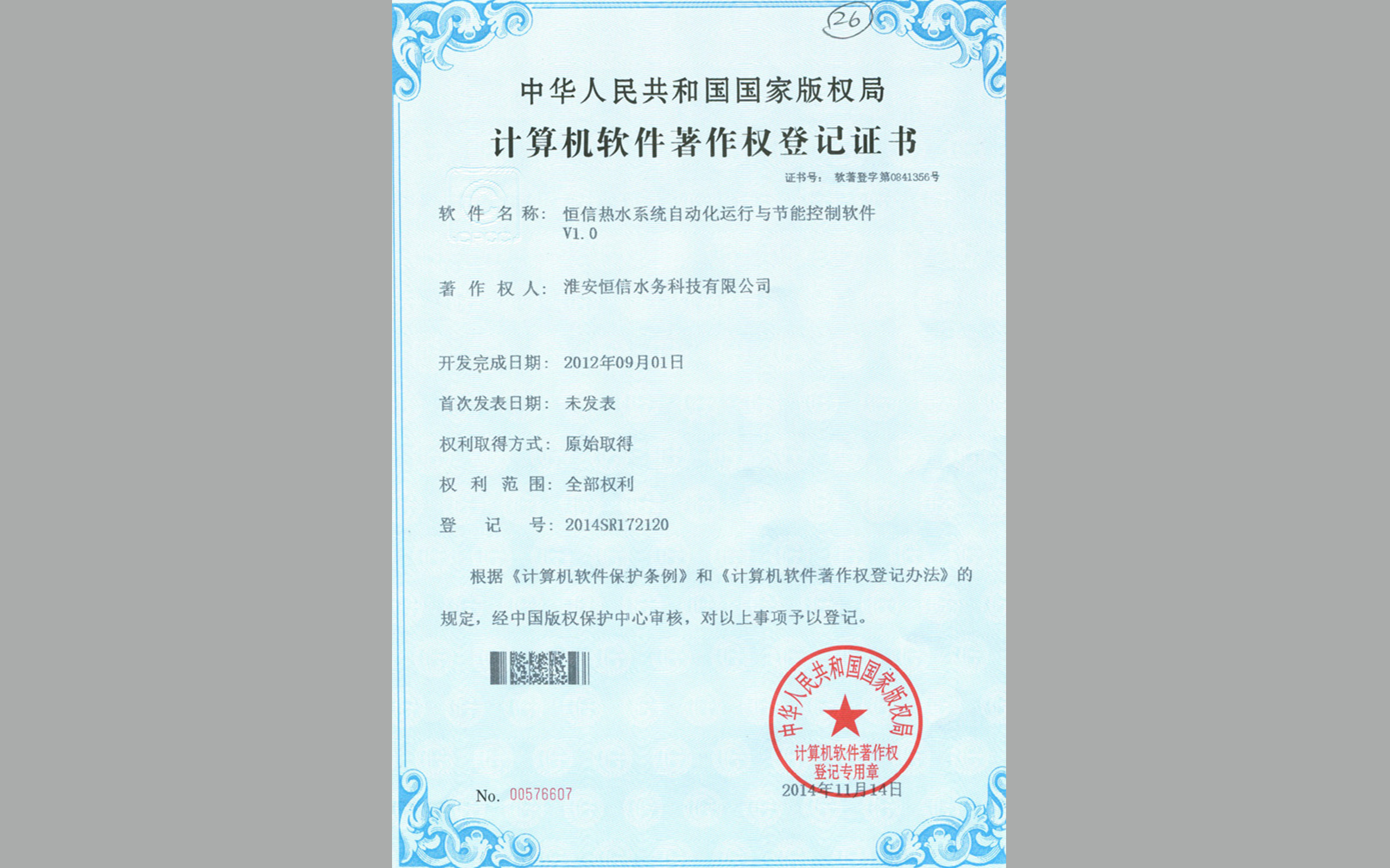 2014年11月,公司研制的热水系统自动化运行与节能控制软件获得国家知识产权局计算机软件著作权登记证书,在软件控制下,设备可根据气温高低、热水用量快慢、废水量多寡及废热水温度的高低,在保证热水产量前提下,自动选择更节能、更省钱的运行模式,运行智能化、实现无人值守。