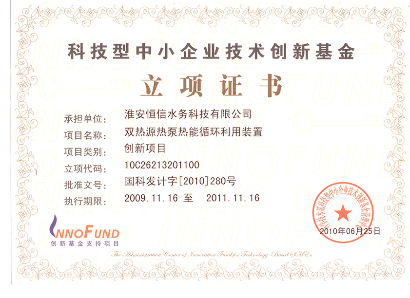 2010年6月,恒信诺金双源热泵废热梯级利用技术与产品被国家科技部列入中小企业创新基金项目。