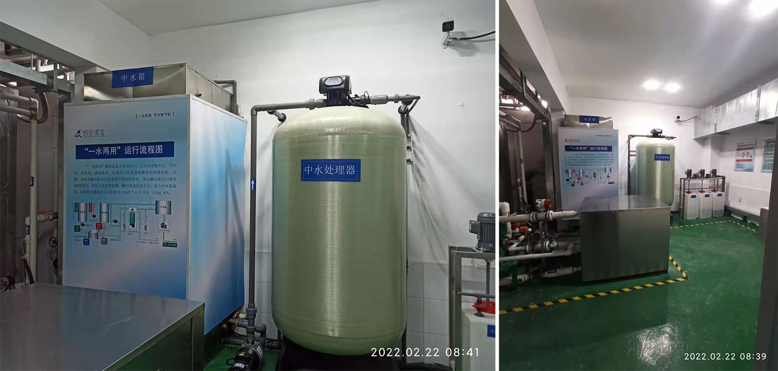 恒信用“一水两用”的新思路和热泵废热梯级利用技术,解决建筑中水回用一直亏损、无法推广的难题,实现建筑中水回用市场化。“一水两用”是指以洗浴废水作为热源并将废水中的废热和废水进行双循环利用,既节水更节能,打造国内和国际水资源利用的新标准。恒信在公司内建立一套一水两用试验系统