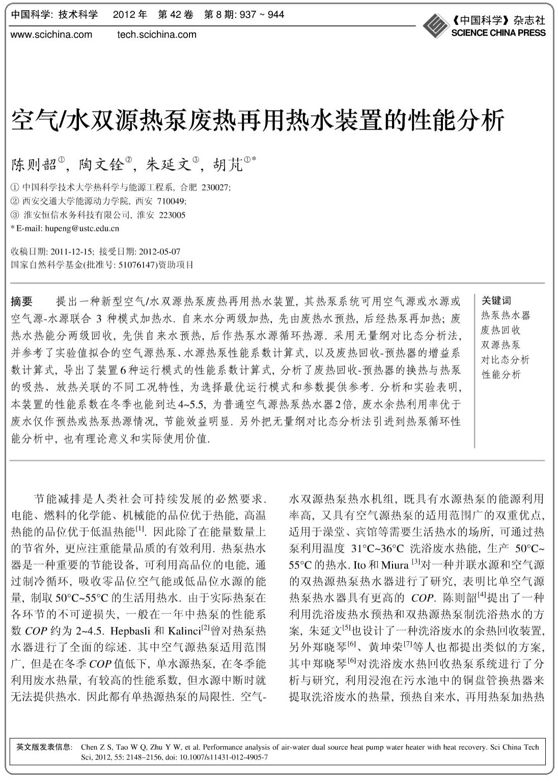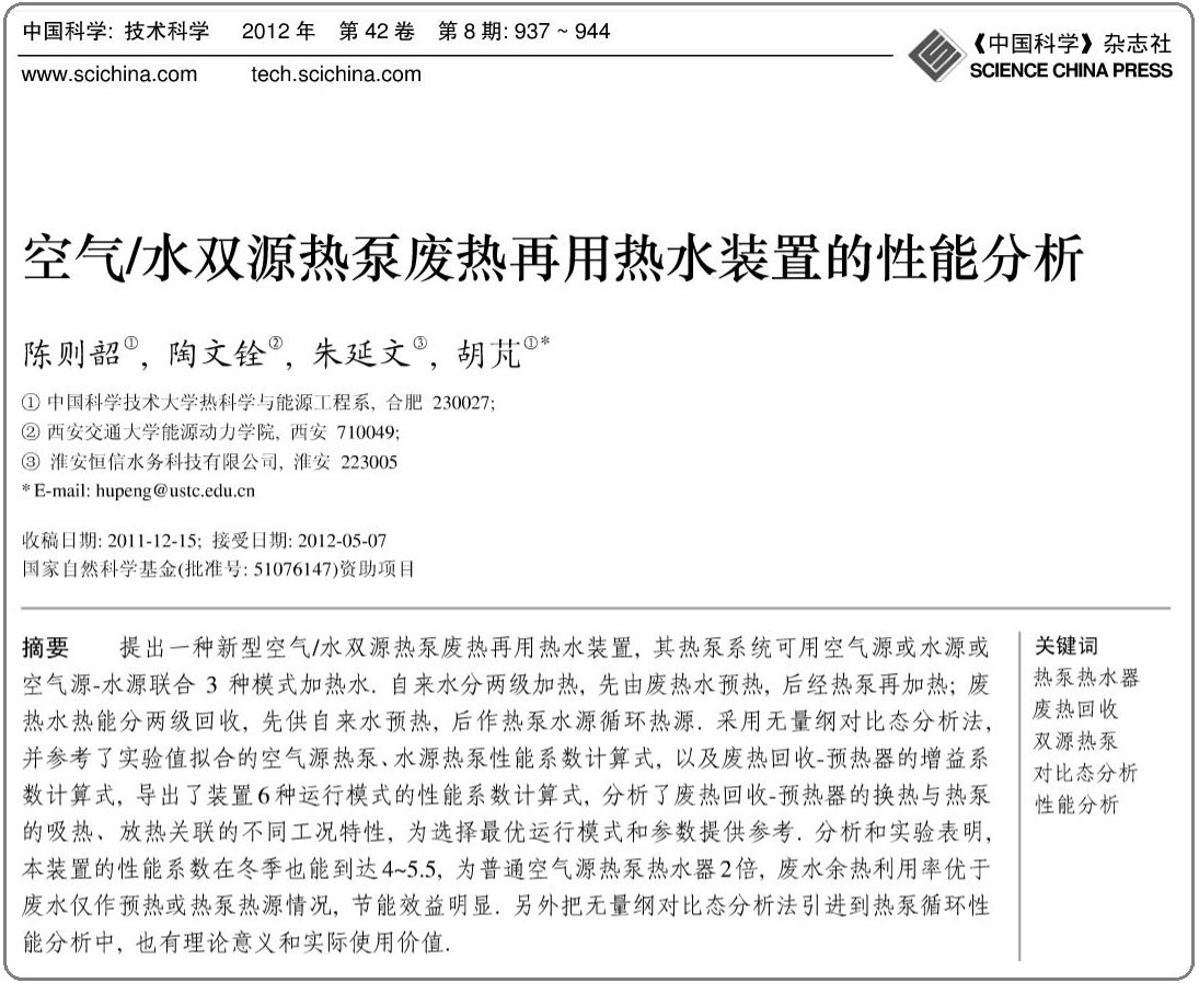 陈则韶教授、陶文铨院士、朱延文董事长在自然科学杂志《中国科学》上发表双源热泵有关论文。