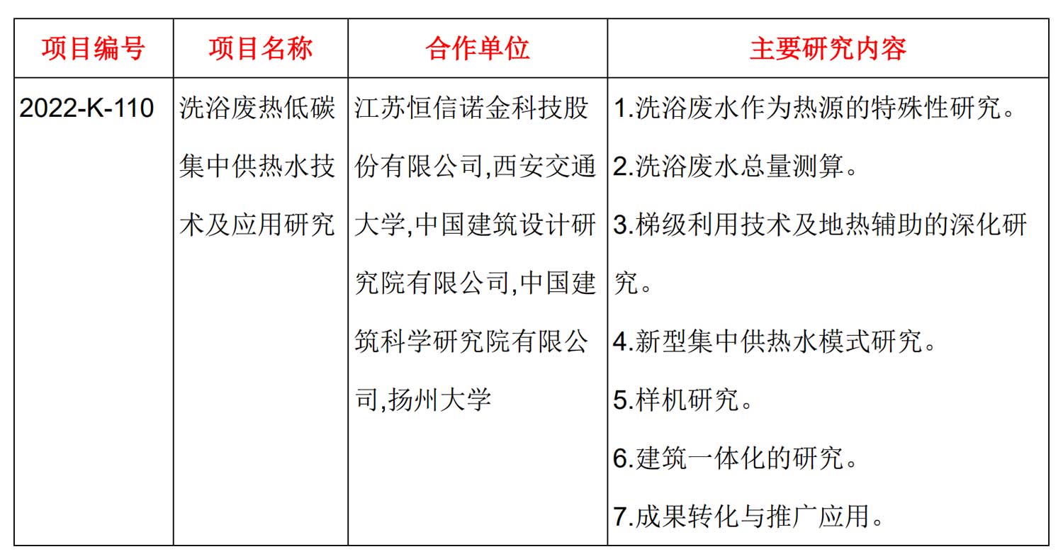 2002年7月,恒信承担住建部《洗浴废热低碳集中供热水技术及应用研究》项目(已被列入2022年科学技术计划项目)。